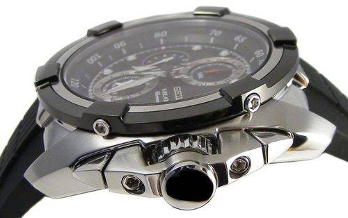Single protected crown and integrated dual push buttons for chronograph and alarm functions.
