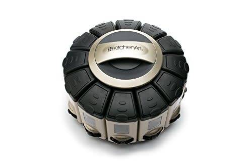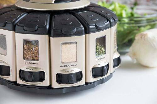 8.25 x 9 x 6.5 inch, each canister holds 4.5 oz. each made of durable plastic with a beautiful champagne satin finish. Get the exact amount needed without measuring spoons; twist the dial for a perfect 1/4 tsp. measurement Includes 12 removable spice compartments on a rotating base and 55 spice labels. Mounts under a cabinet or shelf, or fully stackable for easy storage of 24, 36 or 48 different spices