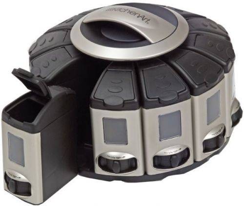 In need of easy storage for your spices? The Select-A-Spice Auto-Measure Carousel Professional Series provides a unique way to store and sort cooking spices. The Auto-Measure Carousel can be mounted under the cabinet or double stacked. 55 spice labels are included for you to apply to the 12 canisters for easy assortment (spices not included). Each canister holds 4.5 oz. of spices and automatically measures a perfect 1/4 tsp with each click. The canister also gives you the option to either shake or pour your spices out. Witness the space-saving functionality of this useful tool.