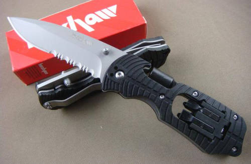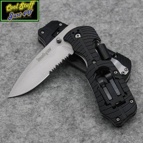 Blade: 85mm. Full length: 190mm. Weight: 140gr; Glass-Filled Nylon Handle (Anti-Skid) and Back Clip; 8Cr13Mov Stainless Steel Fine Edge Blade with 59HRc Hardness; Multi-Function Screw Connector with 4 Screw Heads; Manual Assisted Blade with a Liner Lock with half plain cutting edge & the other half serrated sawing blade!