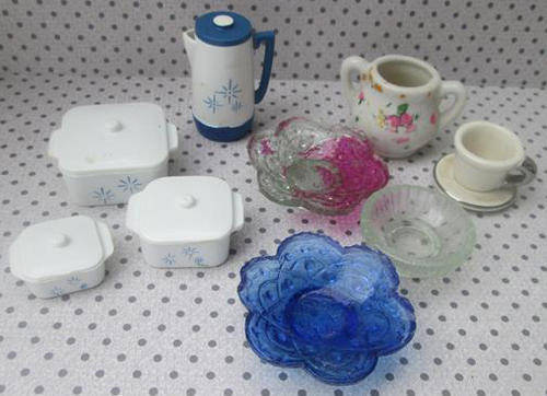 VINTAGE SELECTION OF DOLL HOUSE MINIATURES, THE GLASS BOWLS ARE VINTAGE, COLLECTABLE AND VERY PRETTY, ONE HAS PARTIAL PAINT LOSS, IT WOULD BE EASY TO REMOVE THE PAINT.