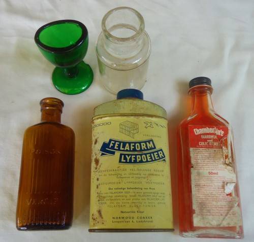SELECTION OF VINTAGE MEDICINE BOTTLES & TIN WITH GREEN EYE BATH