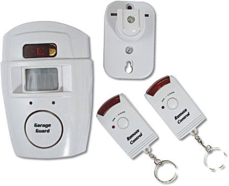 Battery operated motion sensor alarm, perfect for use in garages or sheds.