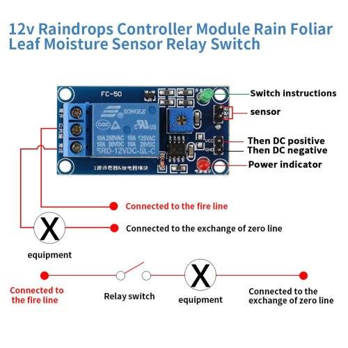 When connected to power, the power indicator light, the sensor board does not drop, the relay does not operate, switching lights off, drop a drop of water, the relay start related equipment, switch indicator light,