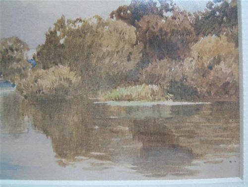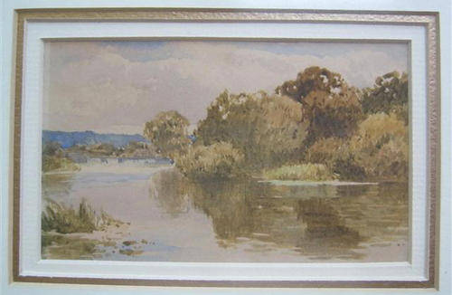 TRANQUIL WATER AND LANDSCAPE SCENE, WATERCOLOUR PAINTING PROTECTED BEHIND NON REFLECTIVE GLASS, WITH A PRETTILY SHAPED FRAME, COLOURED GOLD. THE PAINTING IS 15 X 9CM AND OFFSET BY TWO PERFECTLY CLEAN, CREAM MATS AND ONE OF GOLD. THE OUTER MEASUREMENTS ARE 34.8CM X 31CM. THIS PAINTING IS PERFECT IN EVERY WAY AND IS READY TO HANG.