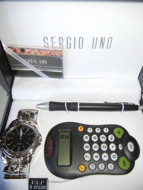 Includes a stainless steel mens watch, solar powered calculator and pen