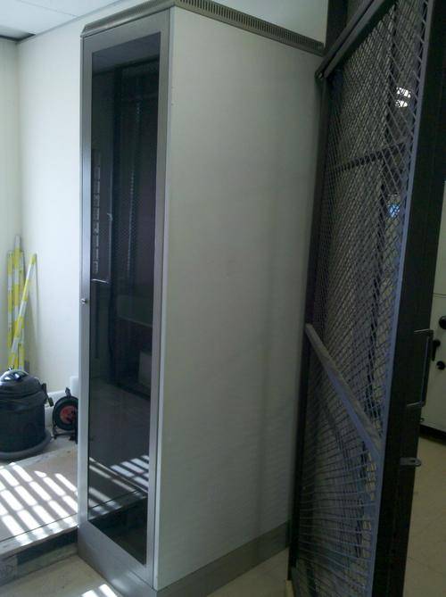 Very sturdy epoxy-coated steel cabinet enclosure in good condition, 47U high (2277mm) for 19 inch rack mount servers. Also has shelves for screen, keyboard, non-rack mount servers.