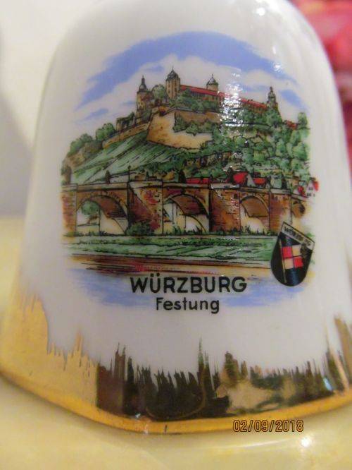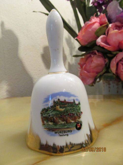 3)- A FINE PORCELAIN TABLE BELL DECORATED WITH GOLD AS WELL AS A COLORFUL IMAGE OF WURZBURG FESTUNG ON ONE SIDE. THIS IS A CASTLE IN GERMANY KNOWN AS THE MARIENBERG FORTRESS. THE BELL IS NOT MARKED OR STAMPED - 13.2cm HEIGHT.....7.6cm DIAMETER