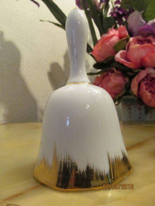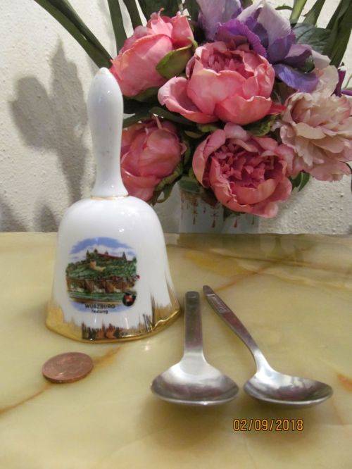 TWO COLLECTABLE VINTAGE STAINLESS TEASPOONS AND AN ADORABLE WURZBURG FESTUNG FINE PORCELAIN GERMAN TABLE/HAND BELL WHICH IS BOTH FUNCTIONAL AND ORNAMENTAL -