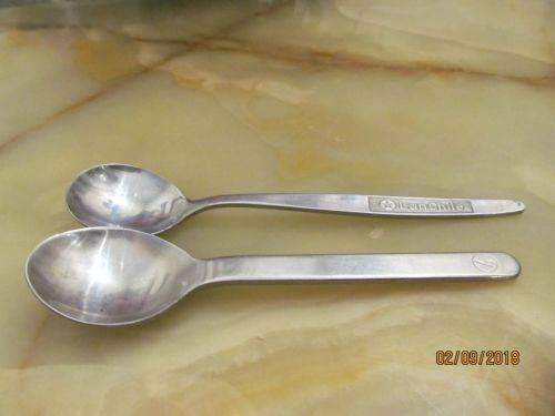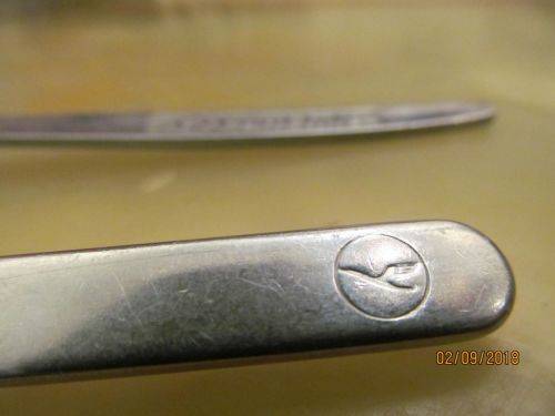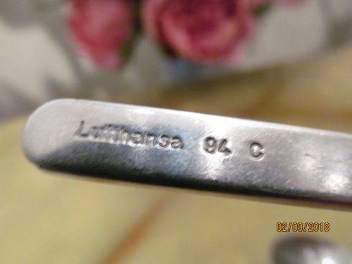2)- A LUFTHANSA GERMAN AIRLINES TEASPOON WITH THE LUFTHANSA SYMBOL ON THE HANDLE FRONT AND - "LUFTHANSA 94 C" ON HANDLE BACK. THE ITEM IS STAINLESS. 12.5cm LENGTH.....3cm WIDTH OF BOWL.....0.8cm WIDTH OF HANDLE