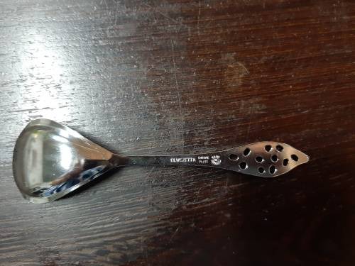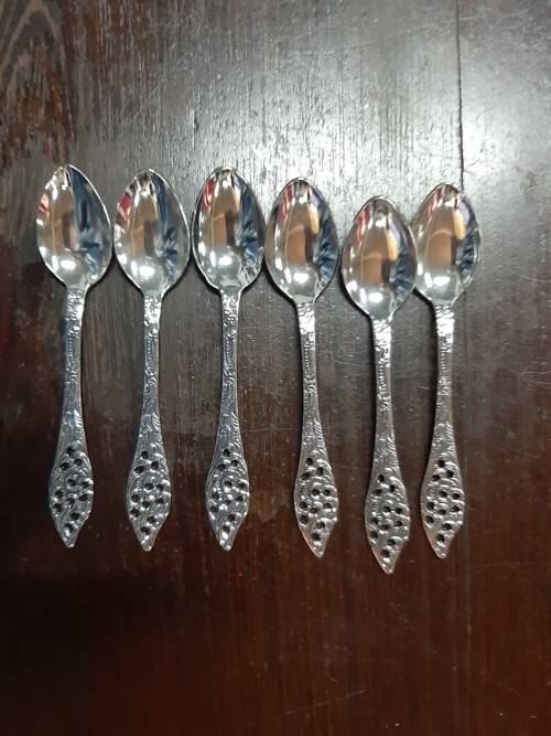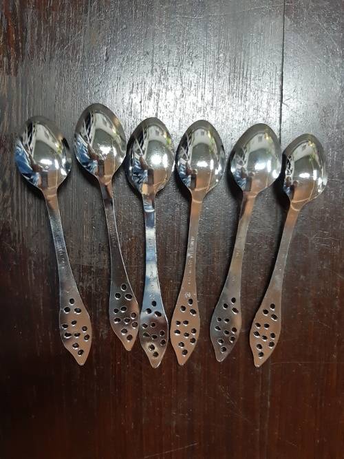 Boxed Set of 6 teaspoons and 1 sugar spoon. Chrome Plated. Label : Royal Dutch Steelworks Elwezetta Line. Made in Voorschoten - Holland.