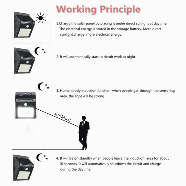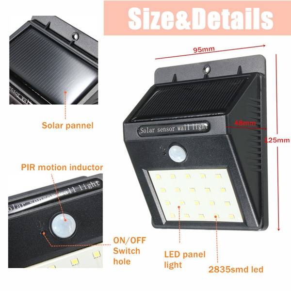 Motion angle and distance:120°,3M Night sensor: less than 10Lux Switch:OFF/AUTO Lighting mode:OFF/DIM light/High light Size:125*95*48mm Feature: -PIR Motion sensor and night sensor -High light and Dim light switch -Recharged by sunlight and battery storage power -Waterproof IP64,heatproof and durable -Over 12 hours lighting time after one day sun charge -Intelligent Energy-saving