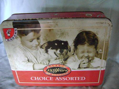 Bakers Choice Assorted Biscuit tin - 150 years of sharing! black & white picture of two children praying with collier dog!