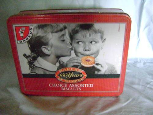 Bakers Choice Assorted Biscuit tin - 150 years of sharing! black & white picture of two children kissing!