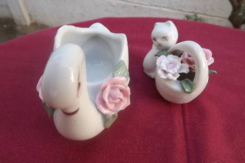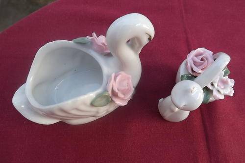 Set of 2 Porcelain Ornaments - Swan and Cat with Pink Roses - swan's height - 8.5cm - good condition
