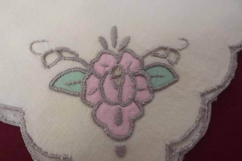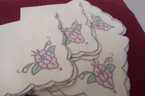Set of 4 Vintage Embroided Linen Napkins - cream with pink - as new - 28cm diameter