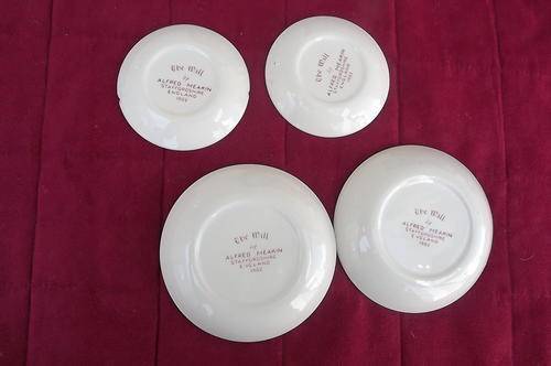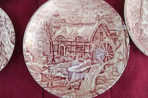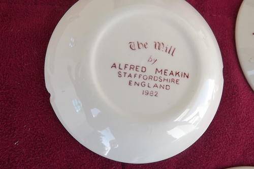 Set of 4 white with maroon colour pattern of The Mill by Alfred Meakin.Staffordshire,England 1982. 2 x 8.25 cm diameter + 2 x 11 cm diameter. Perfect but 1 small plate has some small chips at back - see scan
