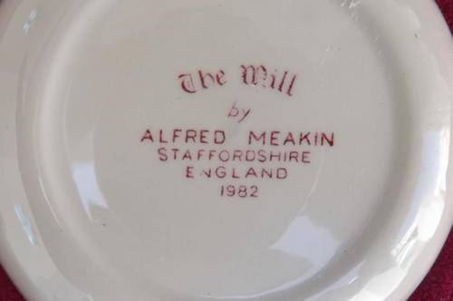 Set of 4 white with maroon colour pattern of The Mill by Alfred Meakin.Staffordshire,England 1982.
