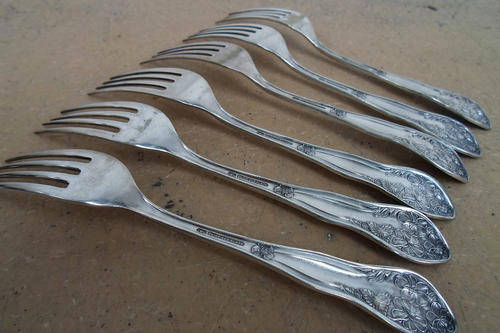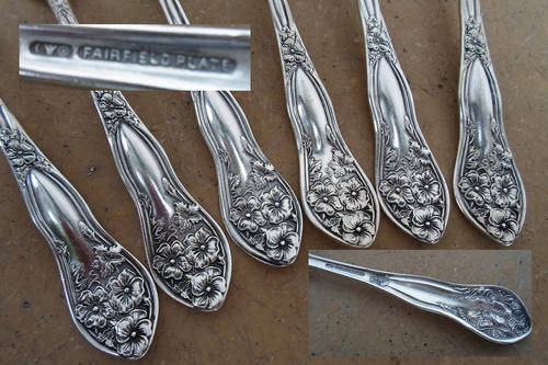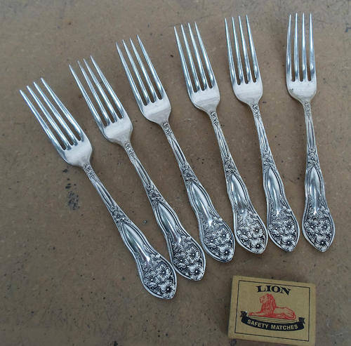 Exquisite set of 6 matching Antique/Vintage silver plated dinner forks with elaborate decorative raised floral design in art nouveau style. Most are in good condition, slightest wear to plate, one fork shows more wear, mainly to the rear and was probably used more often than the others? See pics for details, makers etc.