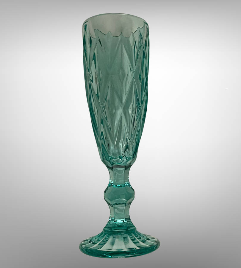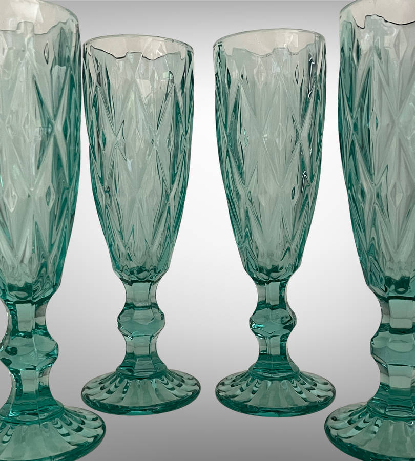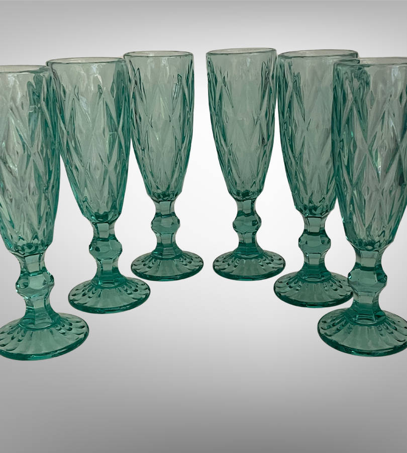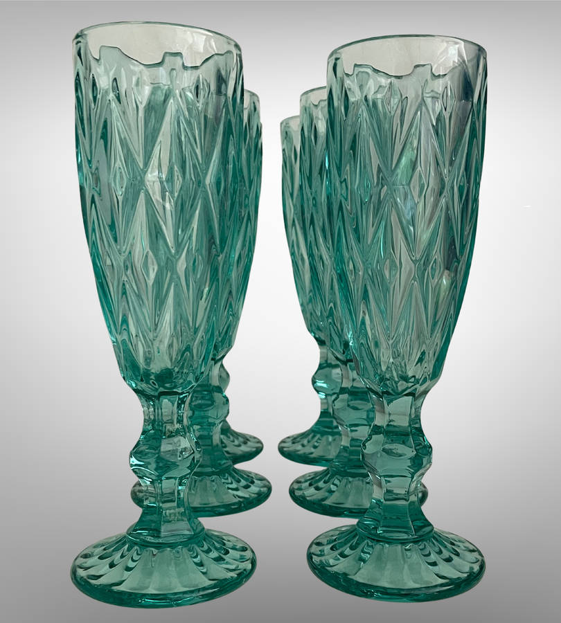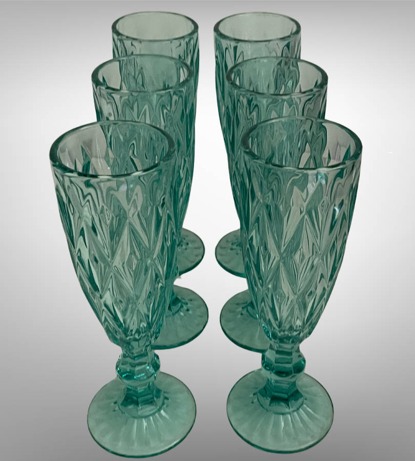 Celebrate in style with this beautiful set of 6 teal green champagne flutes, crafted from thick pressed glass with an elegant diamond-patterned design. Each glass holds 300ml, perfect for serving champagne, sparkling wine, or festive cocktails.