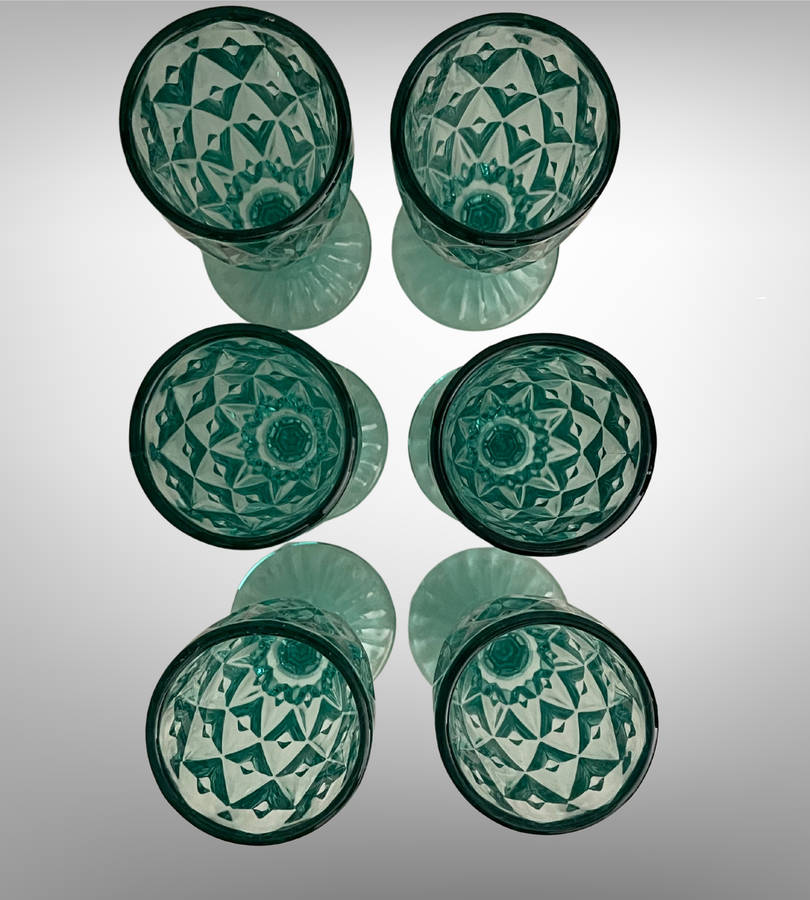 These vintage-style champagne glasses feature a bold teal green color that adds a vibrant and sophisticated touch to any table setting. The durable pressed glass construction and detailed diamond pattern make them a standout choice for parties, weddings, or special occasions.