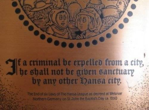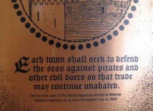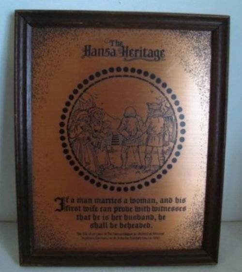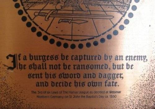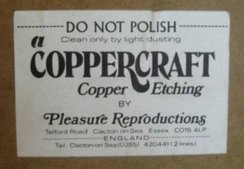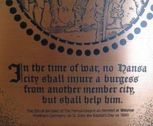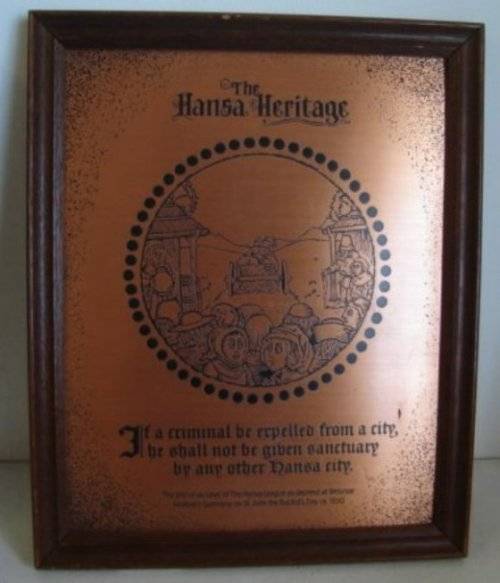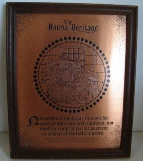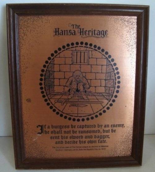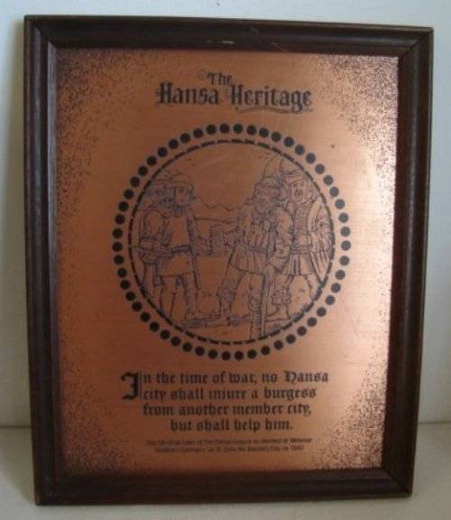 A FULL SET OF SIX ENGLISH COPPER FRAMED ETCHING OF " THE HANSA HERITAGE COLLECTION, THE SIX LAWS OF THE HANSA LEAGUE AS DECREED AT WELSMAR NORTHERN GERMANY ON ST JOHN the BAPTIST's DAY ca 1260, each size 27cm X 33cm, age spots.THERE ARE SIX LAWS EACH ON ITS OWN PLAQUE, READ EACH PLAQUE, MARKED TO BACK, MADE IN ENGLAND.