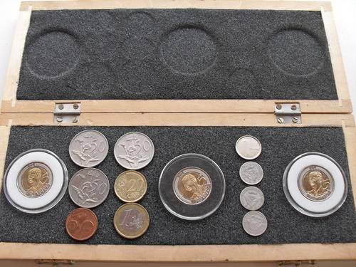SET OF DIFFERENT COINS IN WOODEN CASING UP ON