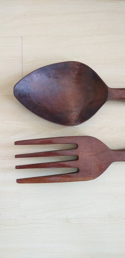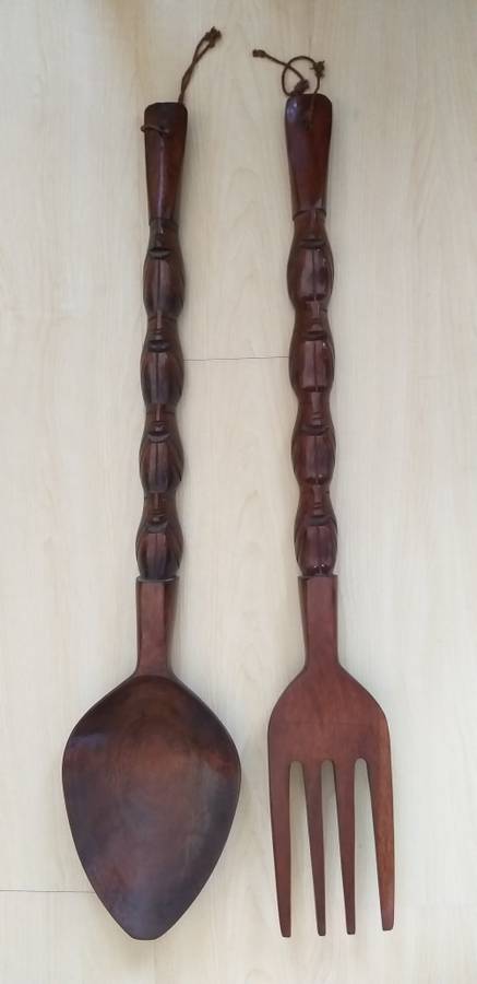 Set of Large Wooden Spoon & Fork Wall Hanging. size: height 90cm. width of the spoon: 20cm. width of the fork: 14cm