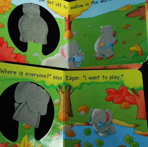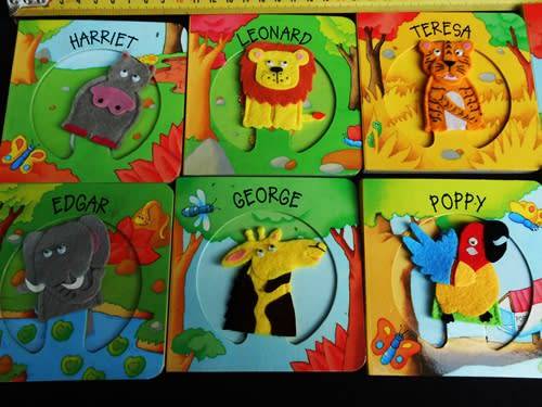This set of small books each feature an animal in a short story suitable for toddlers . Each book has a finger puppet of the animal featured made from felt with googly eyes.The name of the animal in the book starts with the same letter as the name of that animal.like Clara Crocodile or Edgar Elephant.the books are in a 'like new' condition.