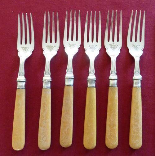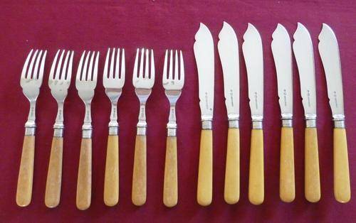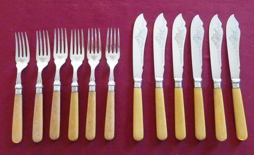A good set of six Victorian bone handles fish eaters with silver plated tines and blades. Knives measure 22cm, forks 18cm. Condition is good for age, some scuffing and discoloration to the bone but no cracks, some minor wear to the plating on the reverse of some of the tines of the forks. Still a very usable set.