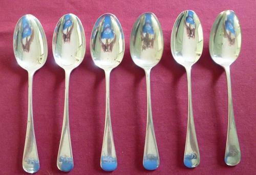 A set of six large and heavy silver plated tablespoons in the old English pattern monogrammed L. The spoons measure 21cm and are in used condition. Two of the spoons have some wear to the tips and two some plate wear to the bowls. Still a useful set.