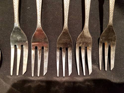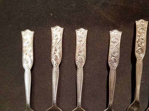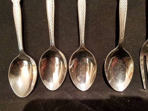 A beautiful set of 5 cake forks and 4 spoons. They measure 12.5cm and 11.5cm in length respectively. They are in good condition and is offered at a low price, act fast and bid now!