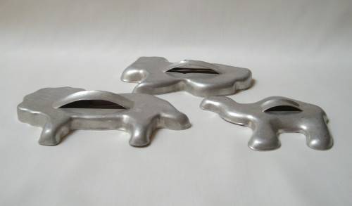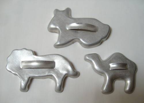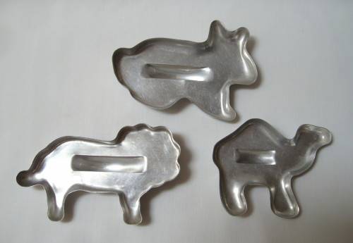 Three aluminium biscuit cutters, a bunny rabbit, lion and camel.