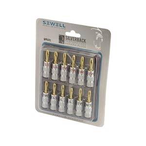 These Silverback banana plugs have the quality you've come to expect from Sewell, including; gold plated connectors, a heavy duty, but light casing, and a tight cable-screw design. What sets these banana plugs apart is its unique 2 screw lock design. This connection will secure your cable more than a single screw, or open screw design. Dual screw connectivity provides a secure connection, durability, and the most crisp and clear signal possible with more signal transmission through contact. Similar to our Pro Maestro banana plug, this easy solder-less installation only requires a small flat head screw driver and four steps. Loosen the screws and feed the speaker cable into the silverback. Lock down the cable with both screws. Screw the banana plug back together. You're finished. All in all you should only need 30 seconds for this entire operation. Today, many electronics use the banana plug interface, also known as binding post (referring to this connection in its female form). This female binding post connection that accepts this banana plug is found commonly on virtually all audio/video receivers, speaker wall plates, and more. Banana plugs offer an alternative to inserting a bare speaker wire into the equipment. Often a bare speaker connection is not as reliable as a guaranteed banana plug connection. Wires tend to get pulled out or frizzy after time passes. Banana plugs require only one install, giving you a permanent and robust connector at the end of your speaker wire.