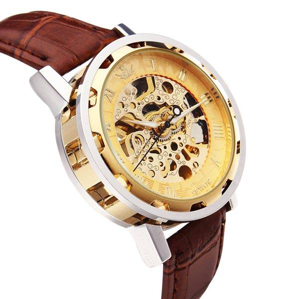 SEWOR Golden Case Mechanical Leather Skeleton Men Wrist Watch