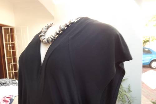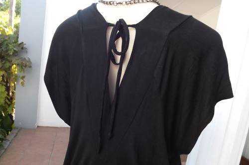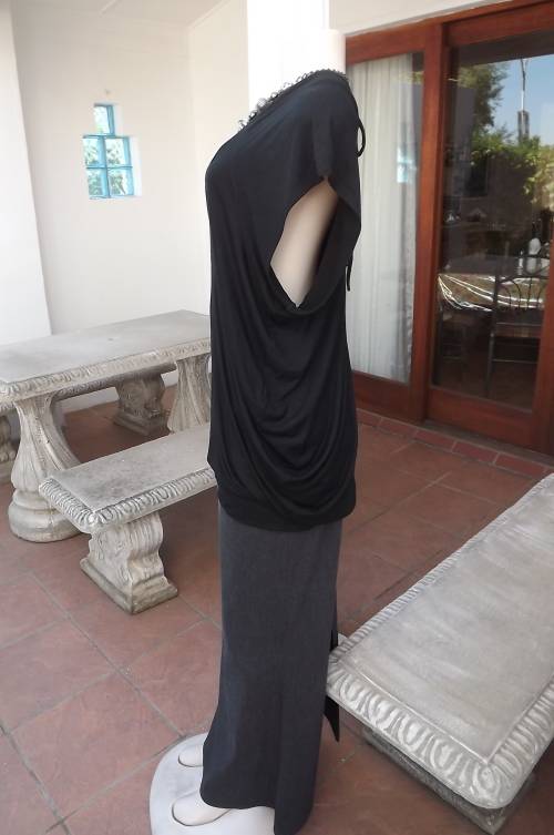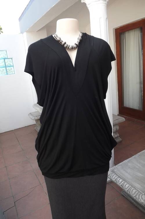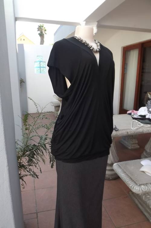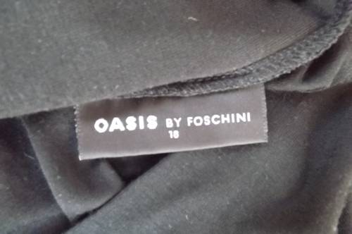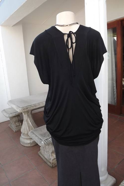 Sexy black low V neck long top by OASIS BY FOSHINI.Size 42/18.In stretch/viscose fabric.Short cut-on sleeves.With band around hips,V neck at back with 2 ties fastening at back.As new.