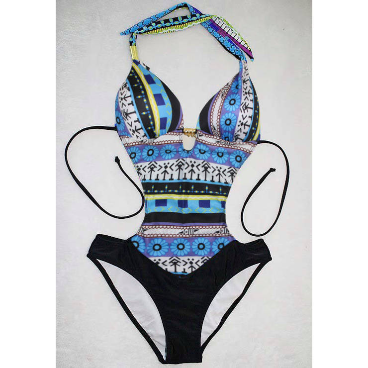 This is women's fashion sexy blue halter neck peculiar pattern monokini beachwear swimsuit.