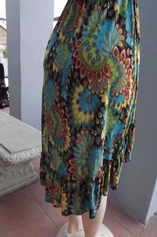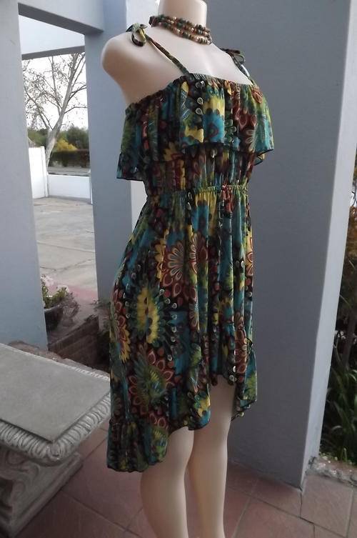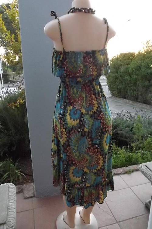 Sexy Multi Colour Silky Polyester Dress with Thin Shoulder Bands in size 8/32 - Frill around bustline, elasticated middle and frilled seam line which is long at the back and short in front - new condition - never worn