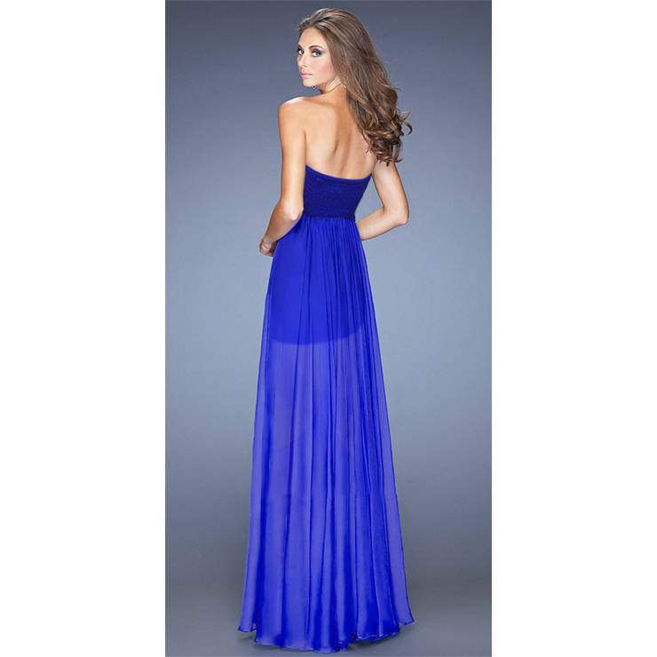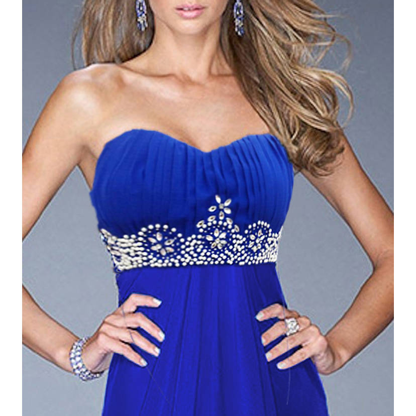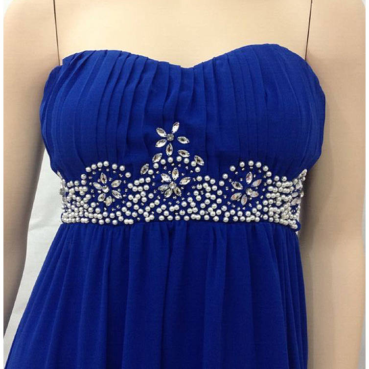 The sexy fashion royalblue a-line sweetheart neck with padded bra empire waist ruffles beading chiffon floor-length gown.