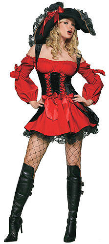 The Vixen Pirate Wench costume includes: a red dress with a peasant-style top and flared skirt. Bow accents and ruching on the sleeves give the dress an essence of romance. The double lace-up, velvet corset and velvet skirt overlay are additional titillating details. Boots, Pirate hat and hosiery are not included.