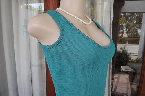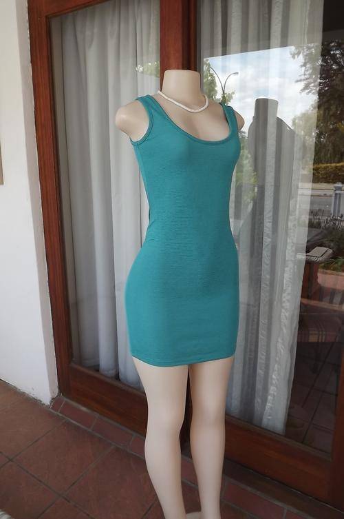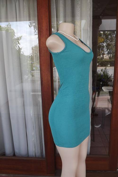 Sexy turquoise body hugging mini dress.Plain and pretty.Size 30/6 by RT.Rounded neckline with low back and short zip.100% Textured stretch polyester fabric.As new