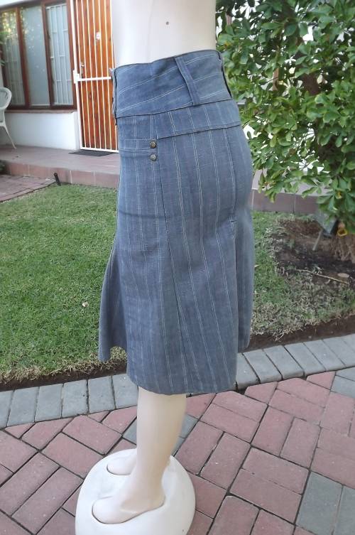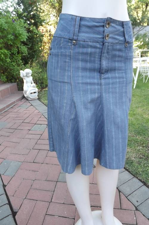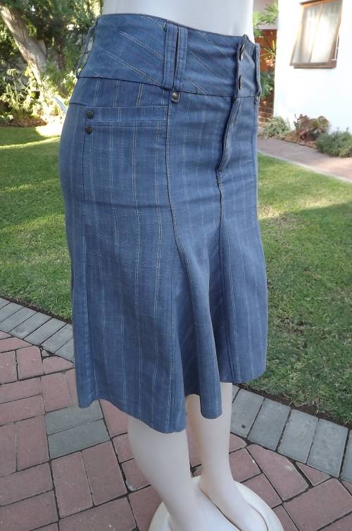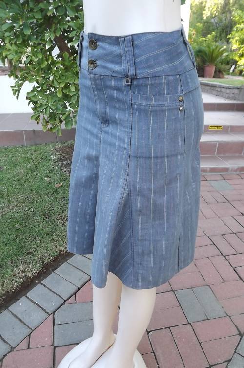 Sexy vertically striped steel blue denim gored skirt with kick out panels.Size 32/8.Wide waistband with zip on front.Pockets on front.In poly cotton fabric.Loops for belt.As new condition.