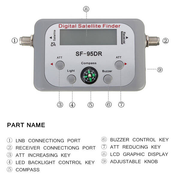 Package weight: 0.22 kgDescription : SF-95DR Digital Satellite Signal Meter Finder Dish Network Directv FTA BUZZER with CompassFeatures :