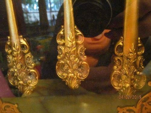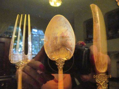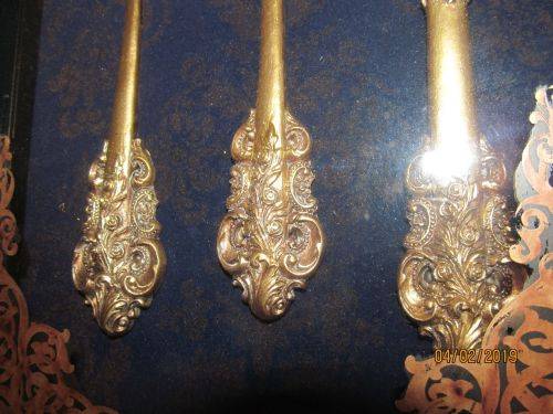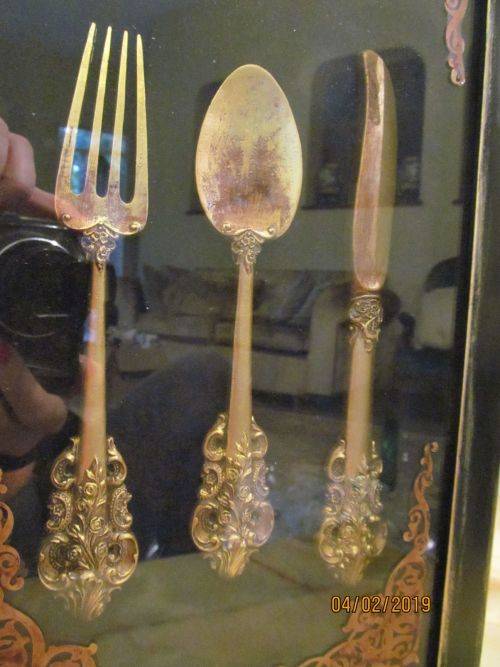 A WOODEN BOX FRAME PAINTED BLACK & GOLD WHICH DISPLAYS THREE ANTIQUE BRASS UTENSILS / CUTLERY ITEMS - A DINNER FORK, SPOON AND KNIFE EACH WITH THE GRAND BAROQUE HANDLE DESIGN CREATED BY WILLIAM S WARREN AND BASED UPON THE RENAISSANCE AND BAROQUE STYLE