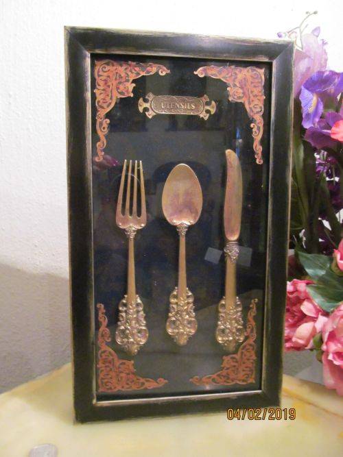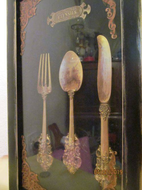 THE FRAME HAS A PROTECTIVE GLASS FRONT AND BACKBOARD AND A BRASS PLAQUE WITHIN - "UTENSILS"