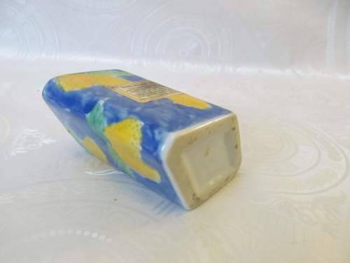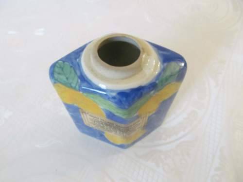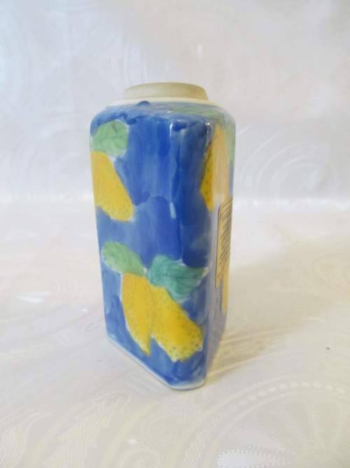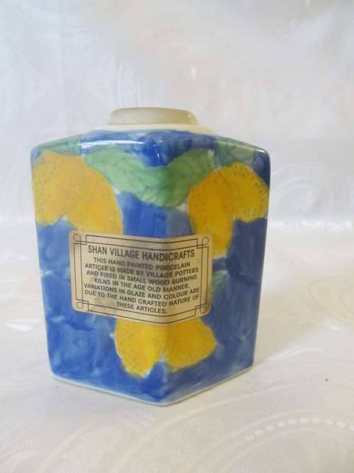 DIAMOND SHAPED AND ENTIRELY HAND CRAFTED AND HAND DECORATED BY SHAN VILLAGE HANDICRAFTS, THIS ITEM IS A VINTAGE PORCELAIN CONTAINER / VASE DECORATED WITH GOLDEN YELLOW AND GREEN FRUIT AND LEAF PATTERNS UPON A BLUE BACKGROUND. SHAN VILLAGE IS LOCATED IN CHINA AND HAS PRECISELY 80 INHABITANTS