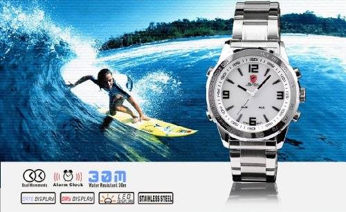 Main Features:1. Bull Shark series; Fashion Sport 2. Designed by renowned Japanese Watch Designer " Mr. Hito Imachi" 3. DOUBLE Movement with the latest breakthrough Japan Quartz Technology4. Specially designed with "Stainless steel" Big Case and Band5. Enable with LED date; day; time Display and alarm function6. Water resistant up to 3 ATM (Not suitable for swimming; deep diving; shower etc.).7. 12 months International Warranty Specification (1 cm=10 mm=0.394 inch)Case diameter: 4cm approx.Case thickness: 1cm approx.Case Material: Stainless SteelBand Length: 25cm approx. (buckle included)Band Material: Stainless Steel Band Adjustable: YesPackage Included:- 1 x Genuine Shark Watch- 1 x Gift Box with Warranty Card- 1 x Users¡¯ ManualPS: Water Resistant 3 ATM or 30 M:Suitability: Suitable for everyday use. Splash/rain resistant. NOT suitable for showering; bathing; swimming; snorkelling; water related work and fishing.Remark: NOT suitable for diving.