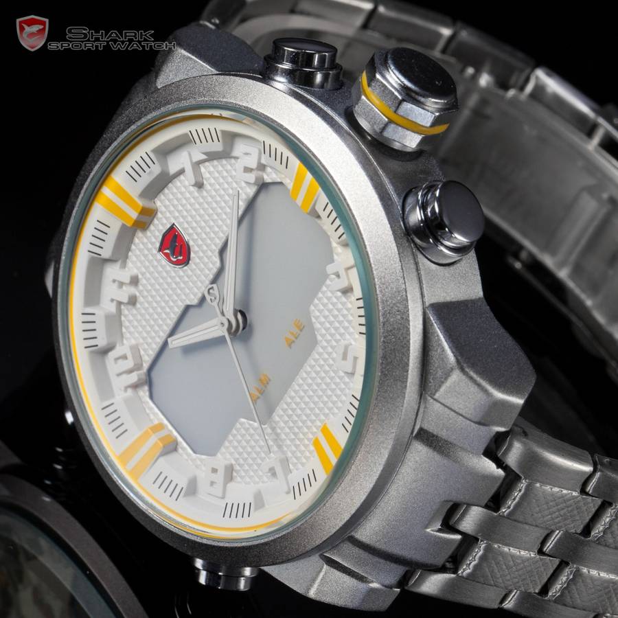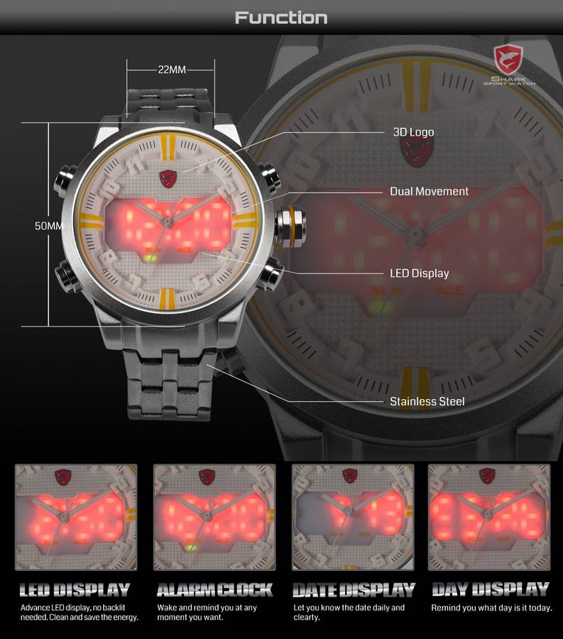 - Dual Movement, analog with LED displaying day and date