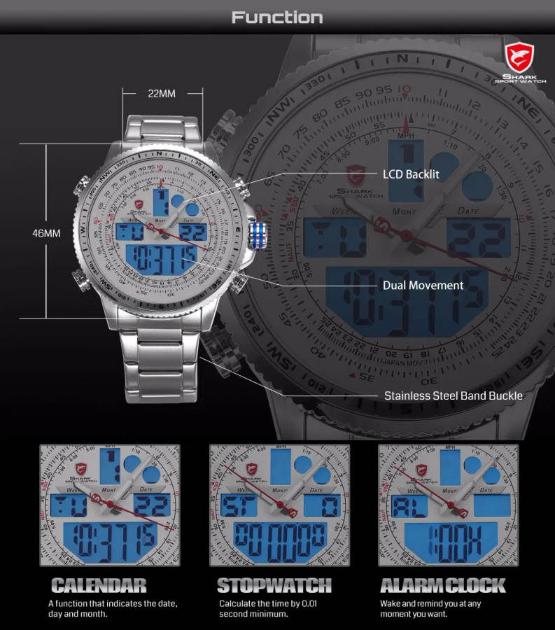 SHARK Winghead Pilot Digital Dual Movement Alarm Stainless Steel Case Sport Watch