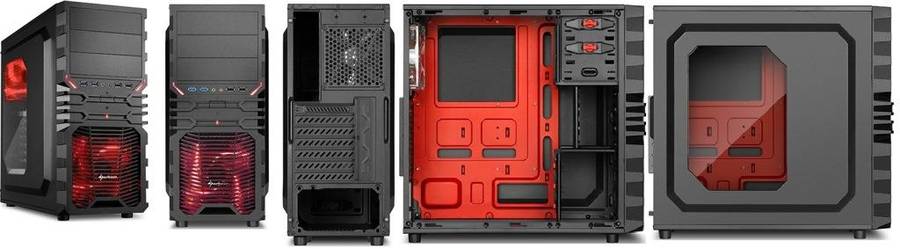 Sharkoon VG4-W Midi Tower PC Gaming Case Red with Window, USB 3.0, Mounting possibilities: 3x 5.25" drive bays (external) or 2x 5.25" drive bays + 1x 3.5" bay (external) + 3x 3.5" hard drive bays (internal) + 4x 2.5" SSDs/HDDs (internal), Front I/O: 2x USB 3.0 (internal 19-pin mainboard connector incl. USB 2.0 plug), two USB 2.0 as well as two audio plugs - NO PSU, Retail Box , 1 Year warranty